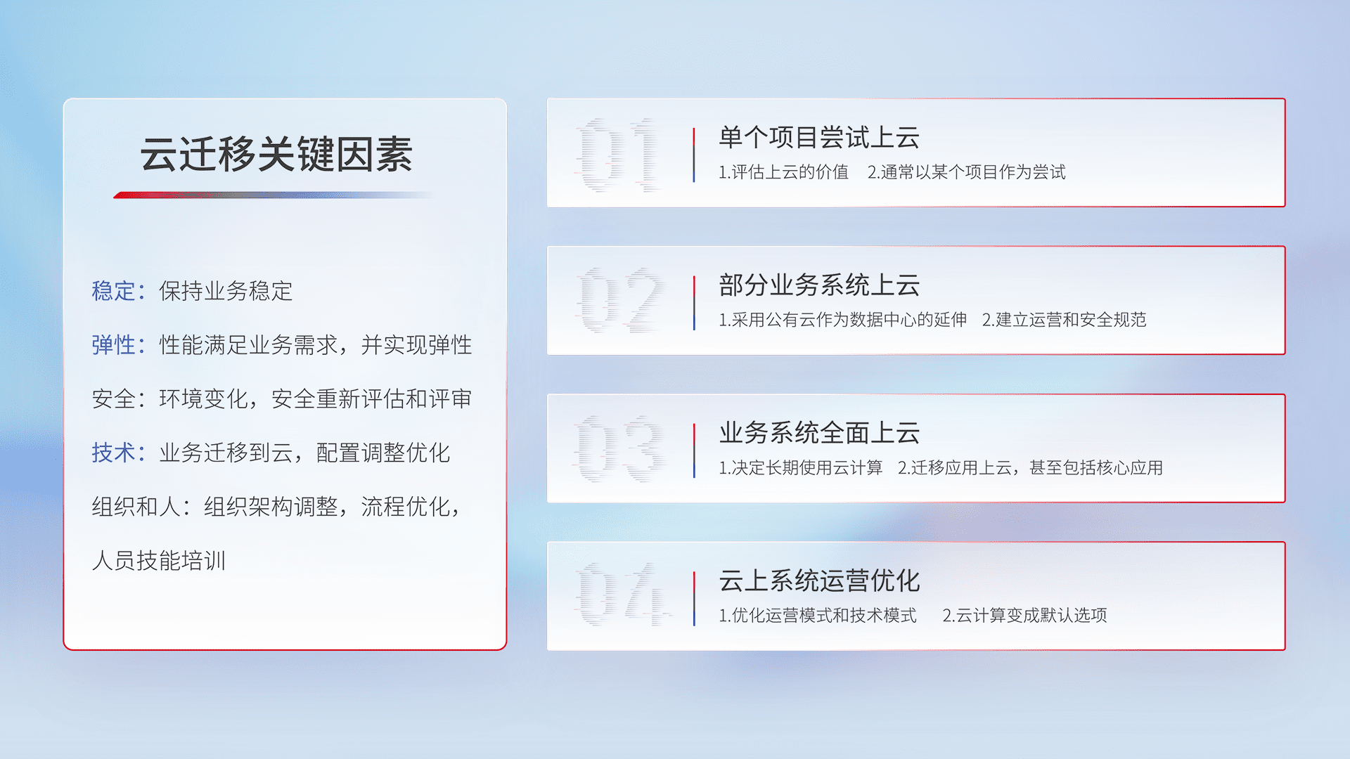 结合实际业务,,,,从规划设计、、、云平台选型、、、云原生改造、、、数据迁移、、、集成交付,,,迁移全过程为客户识别最佳上云路径,,,做好风险识别管理,,,设计网络架构、、、身份权限、、、安全审计合规、、、操作审计、、、日志审计、、、监控告警策略、、、、多站点容灾设计等,,,,对云上基础设施进行整体规划,,,提升IT治理水平,,,,以满足弹性、、高可用、、高性能的需求。。