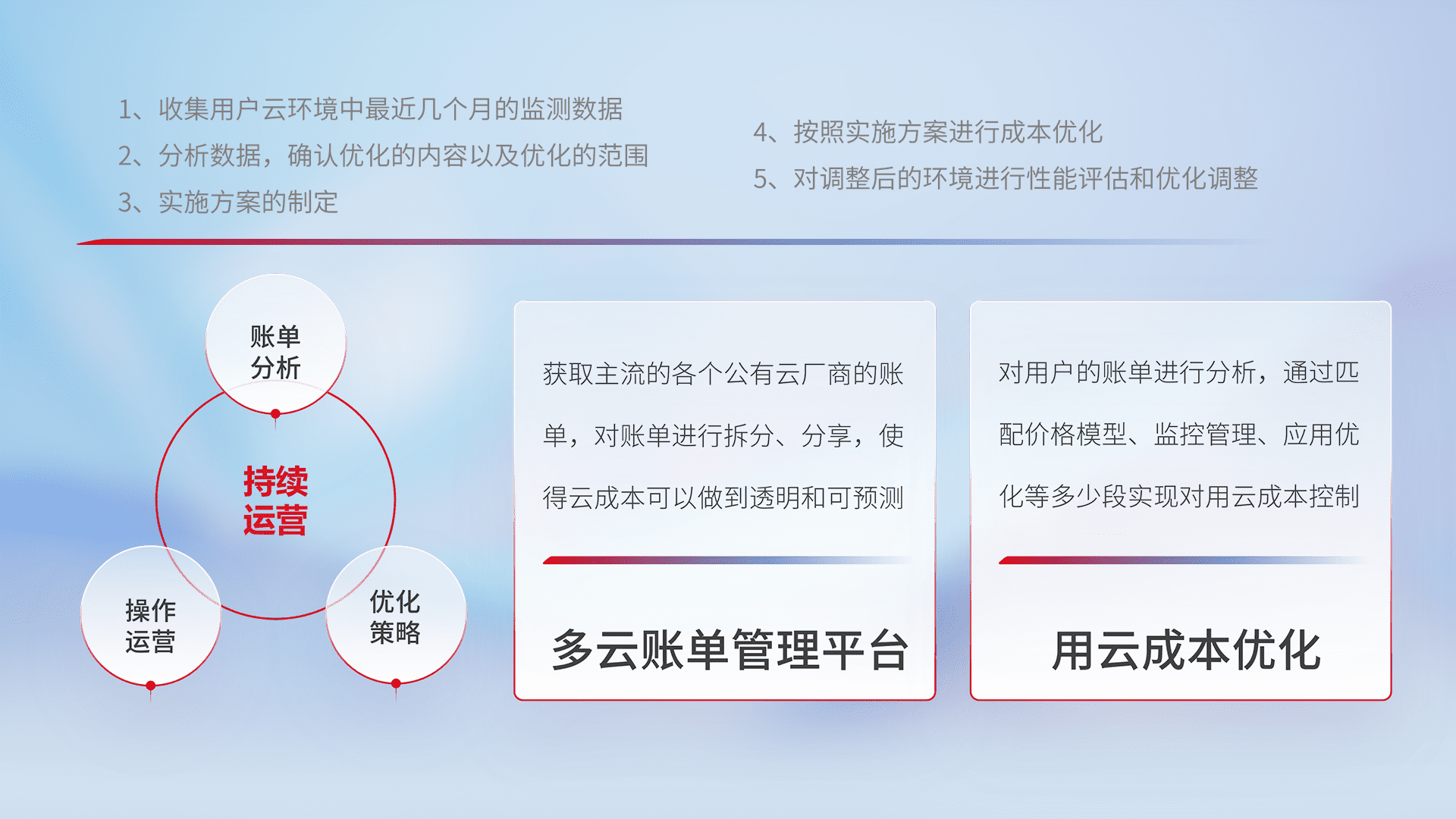 通过多云纳管,,,,以统一的资源数据模型把客户的云资源进行抽象和封装,,,,进而实现对多云资源的统一操作,,保障云资源管理的可靠性、、、稳定性与可用性。。。量身定制化运维内容,,,配置、、、、开发运维、、、补丁管理、、备份、、、、监控、、、、认证和访问管理、、、审计和日常巡检等,,,保障在用云过程中的可靠度,,,,稳定度以及高可用率。。。。